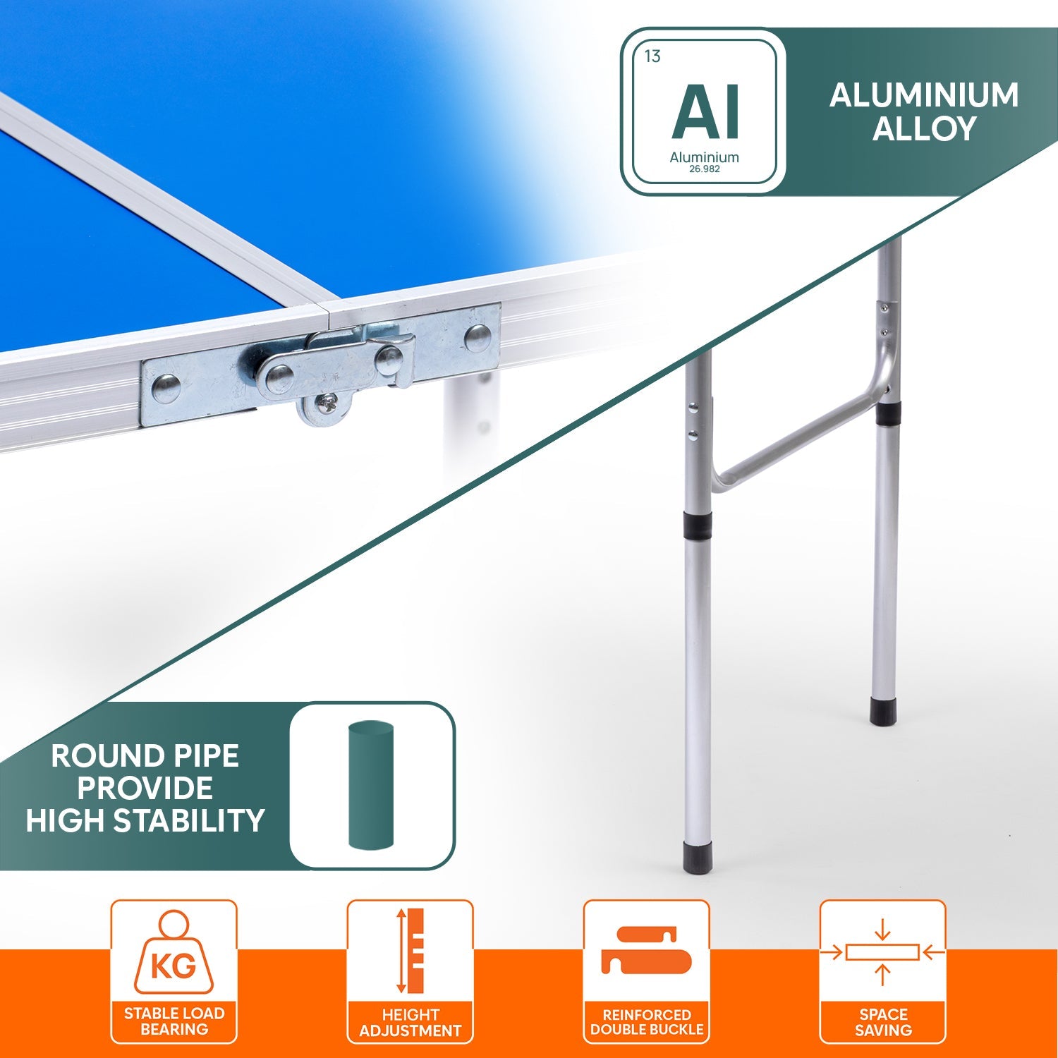 Built with a sturdy aluminium frame and strong round pipe legs, it provides excellent stability while remaining light enough for travel. The smooth tabletop is easy to clean and maintain. Its foldable design allows compact storage and quick setup whenever you need it.